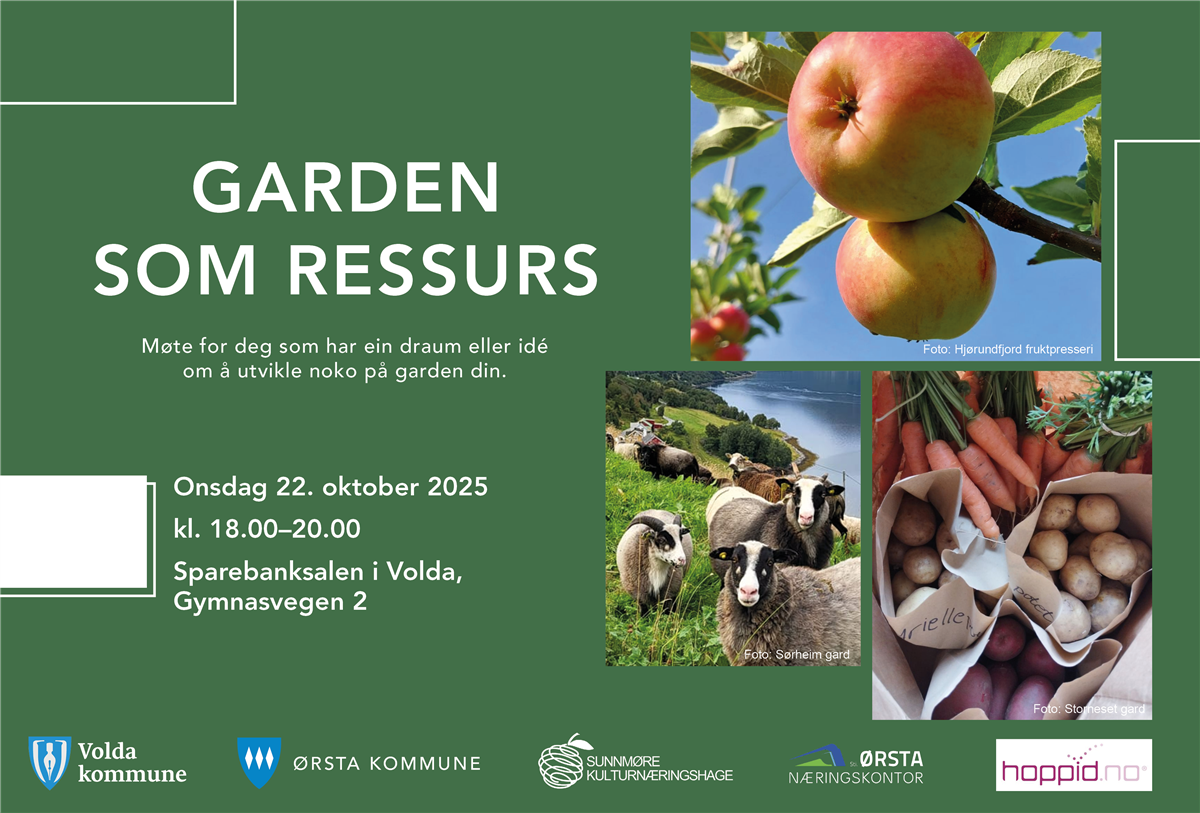 Møre og Romsdal fylkeskommune og Statsforsvaltaren si satsing "Garden som ressurs" har som mål å stimulere til auka samarbeid og engasjement hjå aktørar som brukar garden som ressurs. Møtet skal bidra til å lyfte fram dei som går med tankar om å utvikle noko på eigen gard og bidra til kontakt med støtteapparatet.