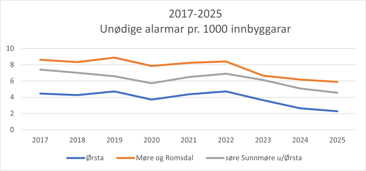 Unødige alarmar per 1000 innbyggar 2017–2025. (Klikk for større bilde)