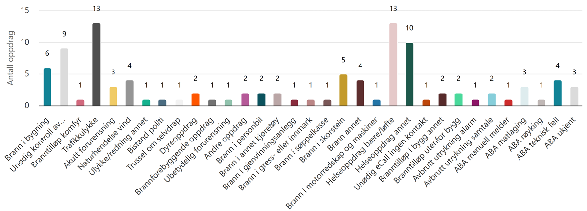 - Andre oppdrag: Alt som ikkje er omfatta av dei andre kategoriane. Eks. bistand politi, sikring, førebygging og støtte til andre etatar.