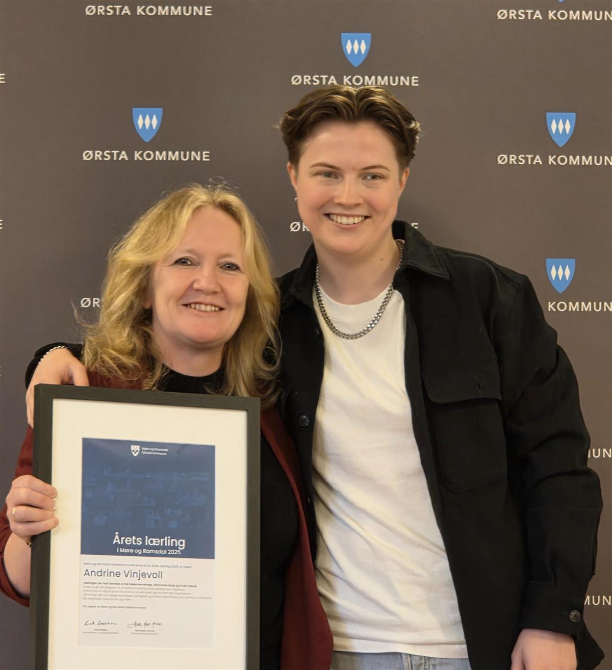 Ørsta kommune fekk også diplom for å ha bidrege til løpet for årets lærling. Lærlingekoordinator Ingvild Aasen og Andrine Vinjevoll.