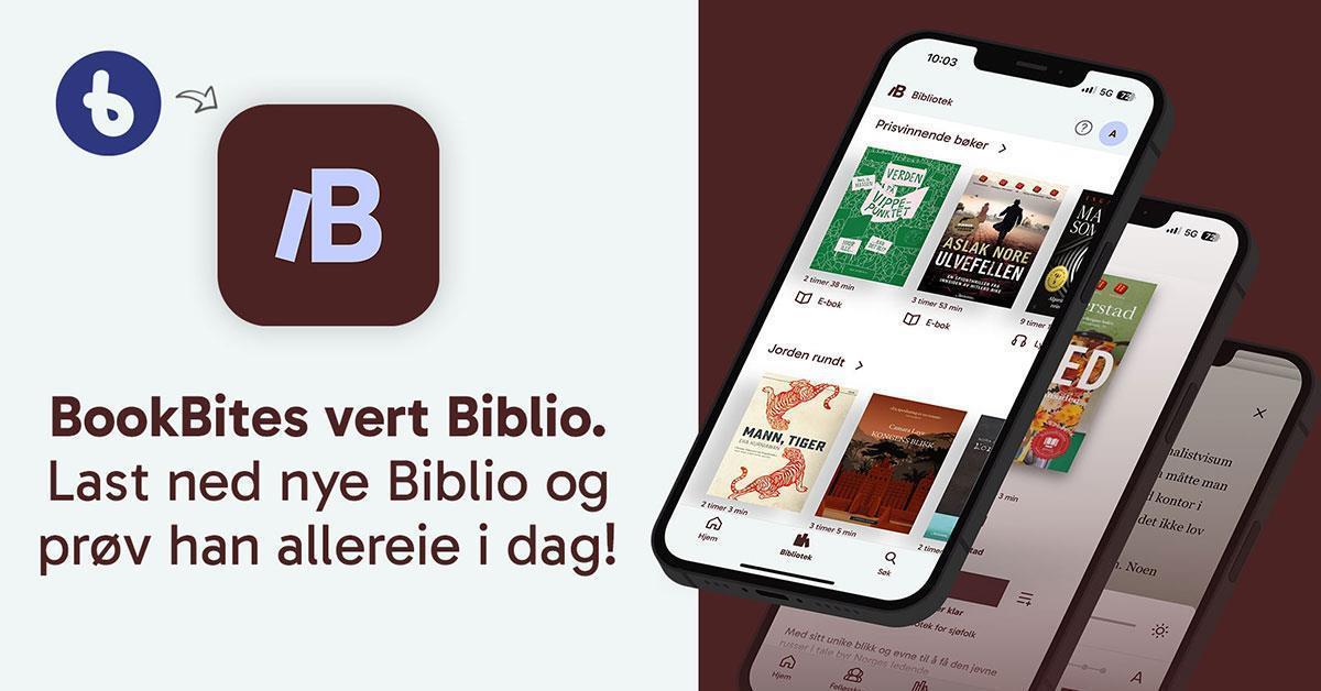 Til deg som brukar BookBitesBookBites blir no erstatta av den nye appen Biblio. Noverande BookBites-brukarar vil få ei melding om å laste ned Biblio-appen. Og frå 11. mai 2026 vil det ikkje lenger vere mogleg å låne bøker i BookBites. Opnar du den gamle appen etter denne datoen, vil det dukke opp ein beskjed om å laste ned ny app for å halde fram med lån av bøker.Kva må du som lånar gjere? Ein kan logge på Biblio med same brukaren som ein har i BookBites, og alle lån vil bli med over. Med andre ord treng du ikkje opprette ny brukar om du allereie har nytta BookBites.Innloggingshjelp til BookBites-lånarar.pdf (PDF, 2 MB)Du kan òg få hjelp til nedlasting/innlogging inne på Biblio-hjelpesenteret: Biblio Help Center