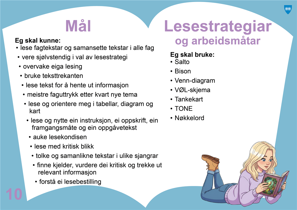 10. trinn Læringsaktivitetar RealfagOrdnivå OmgrepslæringMemory/aliasTokolonne naturfagFør lesingBruk av tankekartDigitale tankekartUnder lesingVenndiagram (døme sansyn matte)StasjonsundervisningProsessnotatEtter lesingRegelbokPlakater i klasserommet-matematikk.orgPlakat med oppskrift på å løyse likningarSpråkfag, KRLE, samfunnsfagOrdnivåForstå fagord og faguttrykk i tekstar: OmgrepsbankOrdbingoTaboo: Taboo pp English, TabuFør lesingTenkeskrivingUnder lesing Lesekor: Lese tekst samtidig i eige tempo. Fint i språkfag som engelsk og framandspråk. DialogkafeEtter lesing Jukselapp (bearbeidd informasjon, komprimert)DialogdukDiskusjonsplakat Kviss og bytt;Debatt, strukturet med reglar, kan også vere med roller SpråkdebattLeseteater: manus foran deg, øve, innleving, ender i ei framføring. Reader’s theater.Raske plakatar, ferdige bestillingar, kort tidsfrist (1 time), tydelig og konkret bestilling. Enkel form, gjerne som tabell. LotusskjemaVenndiagram“Trekk spørsmålskort” - svar i heile setningarSpeeddate 1, speeddate 2Lytte og gjenfortelje:Arbeide med å forstå og tolke skrivebestillingar. Finne verba. Markere det ein har svart på. Arbeide med strategiar som gode lesarar nyttar “Jordnær og høgdsvevande”Praktiske fagOrdnivåForstå fagord og faguttrykk i tekstarArbeidslivsfagTolke planteikningar (design ditt eige rom) Skrive jobbsøknadLese stillingsannonserIntervju: video med råd til intervjuBruksanvisning Skrive loggKunst og handverkVurdere og bruke kjelder om kunsthistorie til videopresentasjonVideoinnlevering digital fordjupingsoppgåve 10.trinnKroppsøvingKart og kompass, orienteringTreningsplanlegging - eigentreningsplanplanlegge og gjennomføre aktivitetProsjektoppgåve kroppsøvig: Frilutftsliv, lesesatsingMusikk Quizlet og BlooketÅ lese notar. MusicTheoryÅ lese noteverdiar med rytmekortVere dirigent: leiing, notenamn, noteverdiar og taktartLese og tolke sangtekst Lese og forstå tabulatur/grepAkkordar og akkordskjema - Bandlab (krev eiga innføring) Sist endra 03.03.2026 10:32