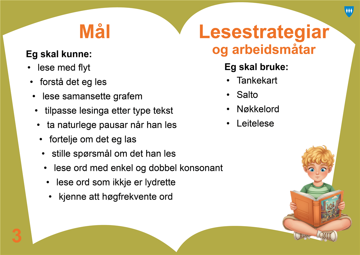 3. trinn LæringsaktivitetarSalto lesestrategi aktivt ved gjennomgang av leselekse og andre tekstar. Ordavkoding Aski Raski StartpakkenLesespel (t.d. “Memory” eller “Filosofen lurer på” under spel i Aski Raski Startpakken)Drill-timar (t.d.høgfrekvente ord)Lese for kvarandre - annankvar setningDomino med samansette grafem Domino med diftongarLese nonord100 og 200-ordslister Kompani O R D - NrksuperASK-basen (FAL) hentediktat, lese tabell, diftongar, samansatte grafem, dobbel konsonant, homonymOrdjakt i tekst (verb, substantiv, dobbel konsonant)Setningar Omgrep AliasTokolonnenotatOmgrepsøvingarBruk av tankekart i heil gruppe før elevane skal jobbe med det sjølvstendig Leseflyt Lese tekstar/bøker, lage tankekart eller nøkkelord om det ein har lese, for så å lage spørsmål til teksten ein har leseJobbe med teiknsetjing når ein skal få til naturlege pausar i lesinga Leseflyt: Innlesing av leselekse på Skolestudio (Aski Raski, Relemo)HøgtlesingSamlesingLese i slangeLesekvartLeselotteriLeseforståing Leseforståing - trekke ut faktaAttfortelje det dei har leseLeseforståingsoppgåver i ulike fagtekstarÅ skrive ned nøkkelord/stikkord etter å ha lese ei tekstBlabbSynonym, antonym og homonymerLese tekstar og teikne noko som passar til det dei har leseBruk av felles tankekart før individuell jobbingSetningar Brukar Salto lesestrategi aktivt ved gjennomgang av leselekse og andre tekstar Sist endra 03.03.2026 10:12