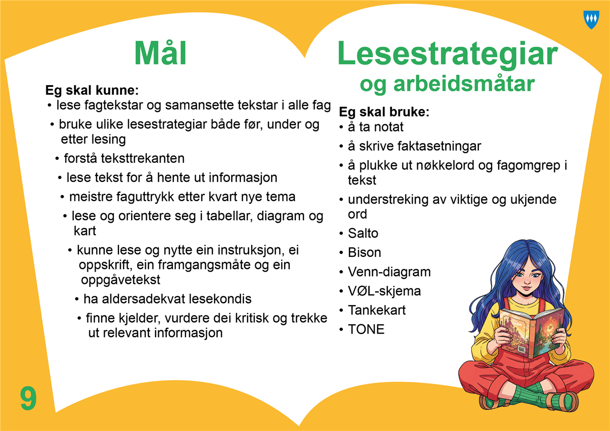 9. trinn Læringsaktivitetar RealfagOrdnivåForstå fagord og faguttrykk i tekstarHot seatQuizletBlooketAliasMålestokk, modellering, nytte rette fagomgrep i klassesamtalar, Lage eige kryssord Begrepsquiz Koordinat-stafett Før lesingTospaltenotat Tankekart - MindMup2Under lesingNærlesing Forsøksbase, å kunne følge ei oppskrift og sjølv finne det utstyret ein treng. Bli kjent med terminologien i faget, og vise labvett (reglar).Lese samandrag førstLesekvart - Naturfag Metodar for leseopplæring Lese tabellar og diagramRekneark, geogebra og programmering. Etter lesingRapportskriving (sjangeren naturfag) Andre aktivitetarActive smarter kids - fysisk aktivitet i læring Språkfag, KRLE, samfunnsfagOrdnivåForstå fagord og faguttrykk i tekstarHot seatQuizletBlooketAliasOmgrepsbingo/flash cards Nytte ordforklaringane i lærebøkeneExitpassFør lesingLesemåtar og lesestrategiarTeknikkar: tankekart, kolonnenotat, styrkenotat, venndiagram, visuelle notatUnder lesingMultiple tekstarLære kjeldekritikk “Bokskredet”Lydfil/podcast: Creaza (Audio Editor) eller Online Voice RecorderEtter lesingStrukturert og ustrukturerte tankekart (MindMup2) DialogkafeAndre aktivitetarDialogkafeSamansette digitale tekstarRetorikk: “Sigerstalen i presidentvalkampen i USA”Retoriske appellformer og språklege verkemiddelPraktiske fagOrdnivåForstå fagord og faguttrykk i tekstarHot seatQuizletBlooketAlias Kroppsøving/valfagOrientere seg i kart: Orientering.NAF - Lesing av skilt og symbolMålestokk Orienteringsløype Friluftsliv: Orientering, knutar, “På med skoa!”Mat og helseLage ei oppskriftAvlesing av oppskrifterForståing av måleeiningarVisuell læring med bruk av forskjellige litermål og anna utstyr.Gjenfortelje oppskrifta før ein får setje i gang.Bytte roller: elevane instruerer kvarandreMusikkQuizlet og BlooketÅ lese notar. MusicTheoryÅ lese noteverdiar med rytmekortLese og tolke sangtekst Lese og forstå tabulatur/grepAkkordar og akkordskjema - tilpass til låtmateriell du arbeider med eller som utgangspunkt i Bandlab (krev eiga innføring) Sist endra 19.11.2025 10:12