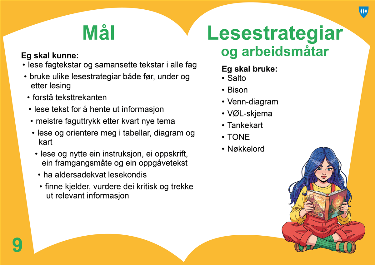 9. trinn Læringsaktivitetar RealfagOrdnivåForstå fagord og faguttrykk i tekstarHot seatQuizletBlooketAliasMålestokk, modellering, nytte rette fagomgrep i klassesamtalar, Lage eige kryssord Begrepsquiz Koordinat-stafett Før lesingTospaltenotat Tankekart - MindMup2Under lesingNærlesing Forsøksbase, å kunne følge ei oppskrift og sjølv finne det utstyret ein treng. Bli kjent med terminologien i faget, og vise labvett (reglar).Lese samandrag førstLesekvart - Naturfag Metodar for leseopplæring Lese tabellar og diagramRekneark, geogebra og programmering. Etter lesingRapportskriving (sjangeren naturfag) Andre aktivitetarActive smarter kids - fysisk aktivitet i læring Språkfag, KRLE, samfunnsfagOrdnivåForstå fagord og faguttrykk i tekstarHot seatQuizletBlooketAliasOmgrepsbingo/flash cards Nytte ordforklaringane i lærebøkeneExitpassFør lesingLesemåtar og lesestrategiarTeknikkar: tankekart, kolonnenotat, styrkenotat, venndiagram, visuelle notatUnder lesingMultiple tekstarLære kjeldekritikk “Bokskredet”Lydfil/podcast: Creaza (Audio Editor) eller Online Voice RecorderEtter lesingStrukturert og ustrukturerte tankekart (MindMup2) DialogkafeAndre aktivitetarDialogkafeSamansette digitale tekstarRetorikk: “Sigerstalen i presidentvalkampen i USA”Retoriske appellformer og språklege verkemiddelPraktiske fagOrdnivåForstå fagord og faguttrykk i tekstarHot seatQuizletBlooketAlias Kroppsøving/valfagOrientere seg i kart: Orientering.NAF - Lesing av skilt og symbolMålestokk Orienteringsløype Friluftsliv: Orientering, knutar, “På med skoa!”Mat og helseLage ei oppskriftAvlesing av oppskrifterForståing av måleeiningarVisuell læring med bruk av forskjellige litermål og anna utstyr.Gjenfortelje oppskrifta før ein får setje i gang.Bytte roller: elevane instruerer kvarandreMusikkQuizlet og BlooketÅ lese notar. MusicTheoryÅ lese noteverdiar med rytmekortLese og tolke sangtekst Lese og forstå tabulatur/grepAkkordar og akkordskjema - tilpass til låtmateriell du arbeider med eller som utgangspunkt i Bandlab (krev eiga innføring) Sist endra 03.03.2026 10:15